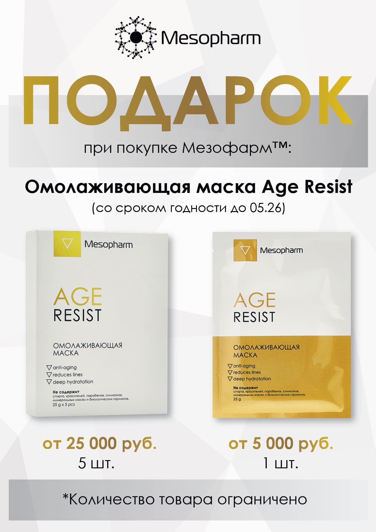 При покупке продукции торговой марки Mesopharm на сумму от 25 000 рублей в подарок к заказу вы получите омолаживающую маску AGE RESIST, 5 шт. в упаковке.