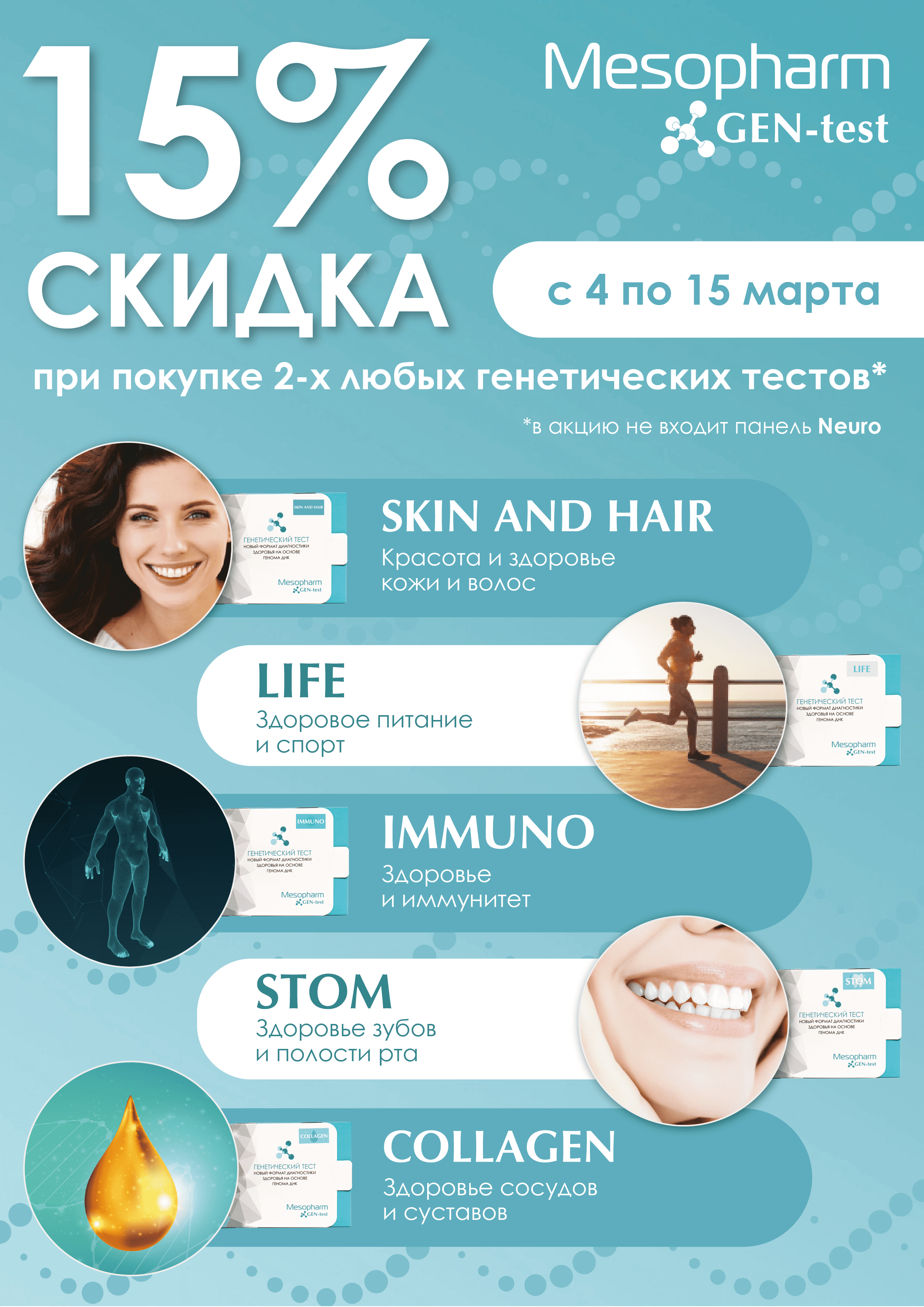 При покупке двух генетических тестов Mesopharm GenTest предоставляется скидка 15%.